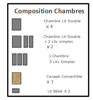 - Une maison principale : 5 pièces 14 couchages + 1 chalet : 2 chambres dont 7 couchages.